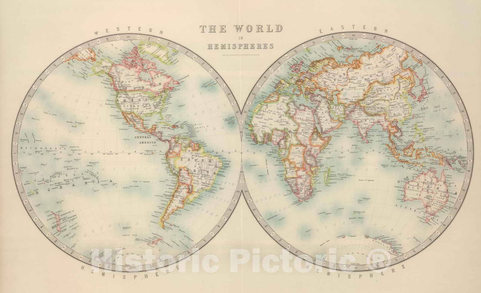 Historic Wall Map : 1912 World in Hemispheres. Vintage Wall Art